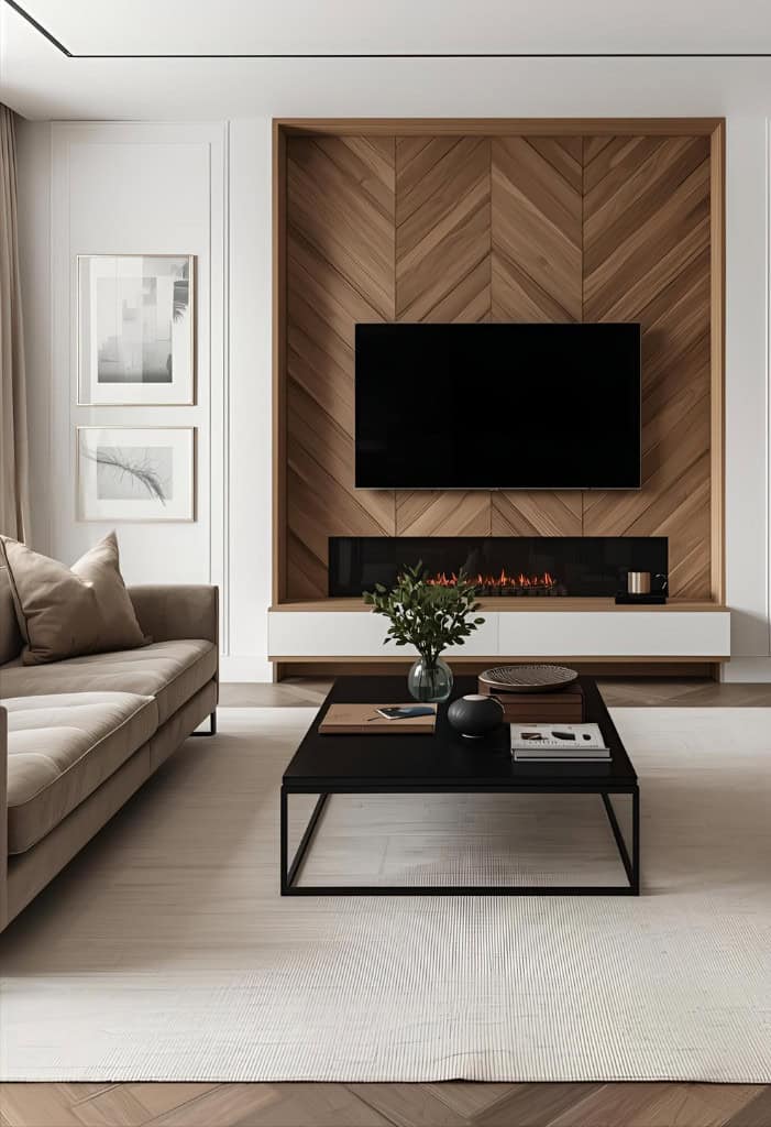 Herringbone wood panels bring a touch of luxury and keep things interesting visually. That classic zigzag pattern draws your eyes right across the wall.
