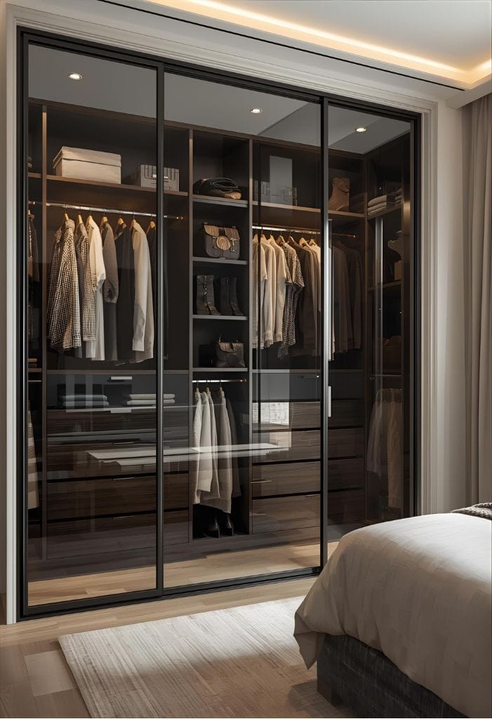 Glass doors paired with modern LED lighting can highlight your favorite pieces. It’s a subtle way to make your closet feel high-end.