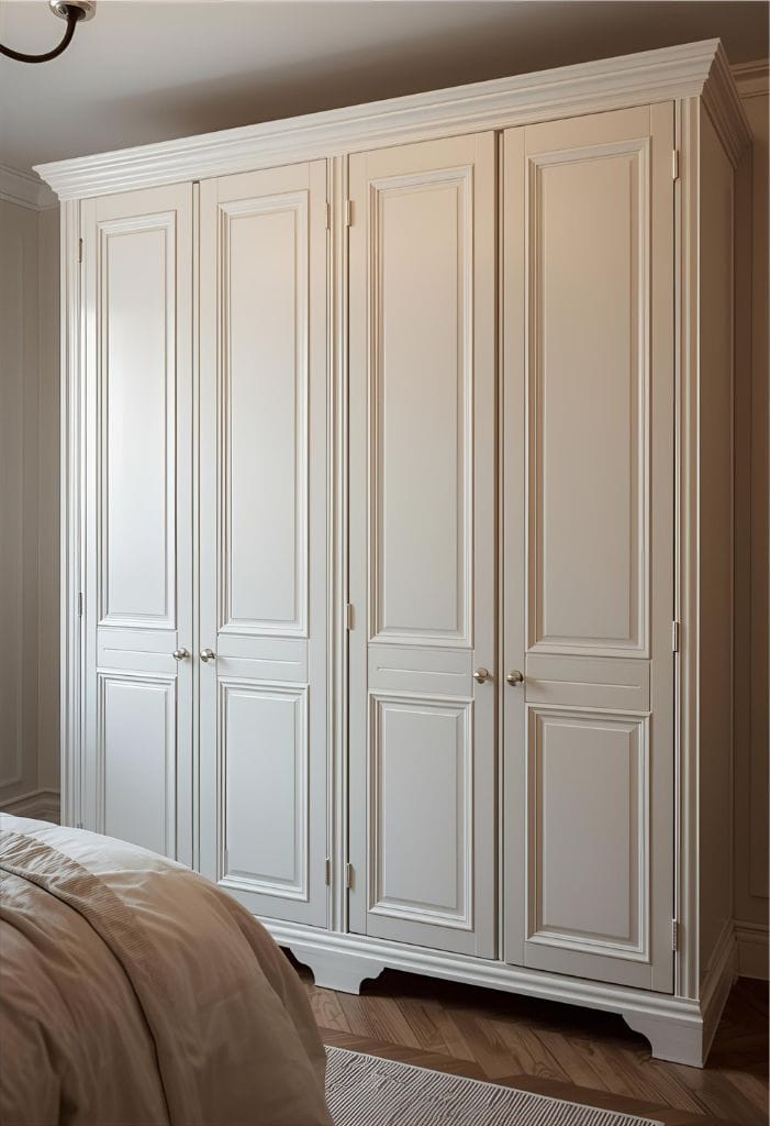White painted Art Deco wardrobe doors bring a bit of old-school elegance to your bedroom. The crisp white finish updates the distinctive geometric patterns and bold lines of Art Deco style.