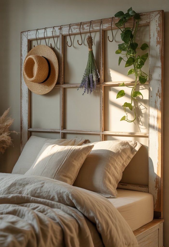 For a functional twist, turn a window frame into a creative headboard. Paint it to match your color scheme or leave it weathered for a rustic look.