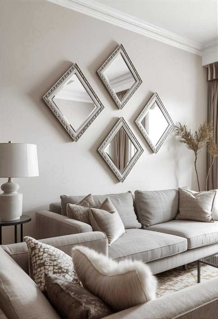 This style fits well in modern or eclectic living rooms. Leave a little space between each mirror so it doesn’t feel crowded.
