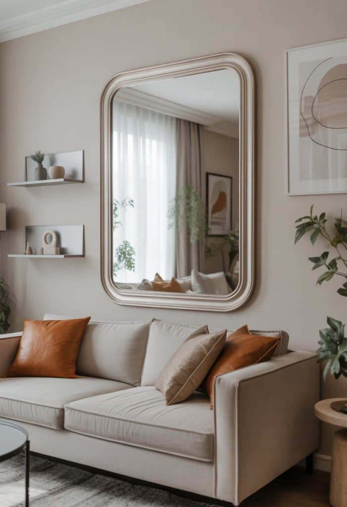 Hang a big mirror above your sofa to create an instant focal point. It draws the eye up and makes the seating area feel special.