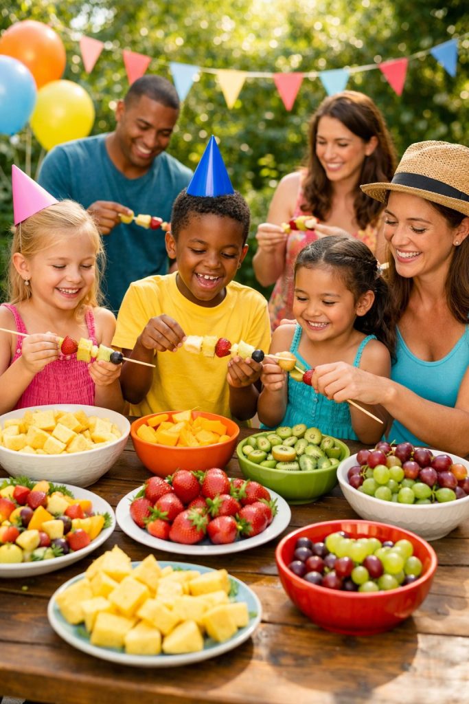 Set up a fruit kabob station and let kids make their own colorful skewers. Offer pineapple, strawberries, melon, and mango on separate plates.