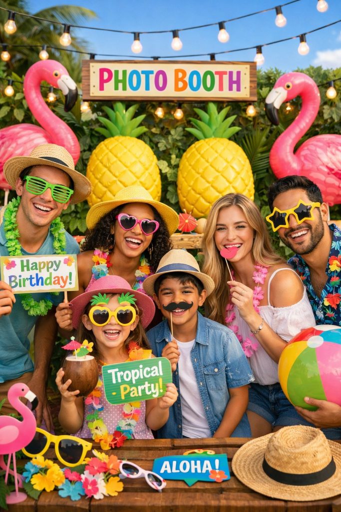 Set up a tropical photo booth with flamingo and pineapple props. Grab a ready-made kit with fun cutouts for both kids and adults.
