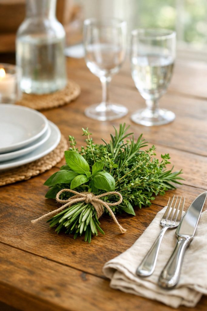 Bundle up some rosemary, thyme, or lavender sprigs and tie them with twine. Set one at each place.