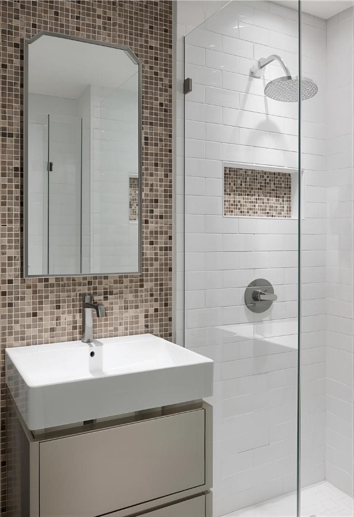 Try a taupe mosaic backsplash behind your sink. It will add style and protect your walls from water splashes. You could also use these tiles to create a lovely accent wall in your shower.