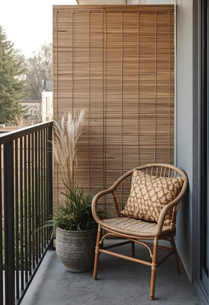 Getting privacy on a tiny balcony can feel impossible. Bamboo screens help—they bring in a natural vibe and are easy to attach with zip ties.