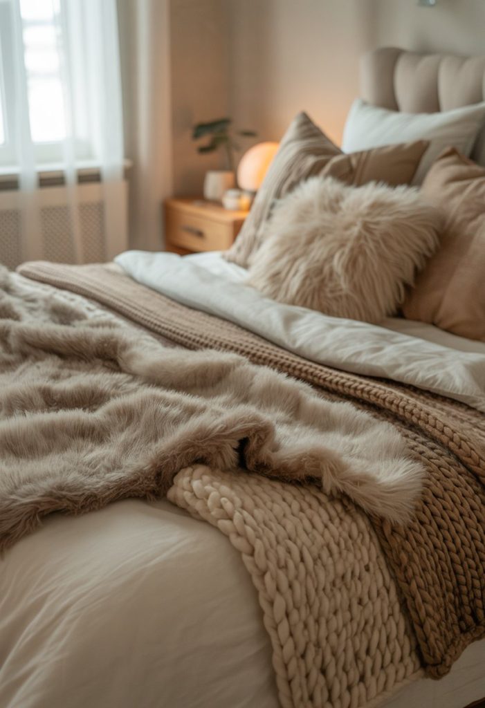 Toss a chunky knit throw at the end of the bed. Drape a faux fur blanket over one corner for a little extra warmth (and style).