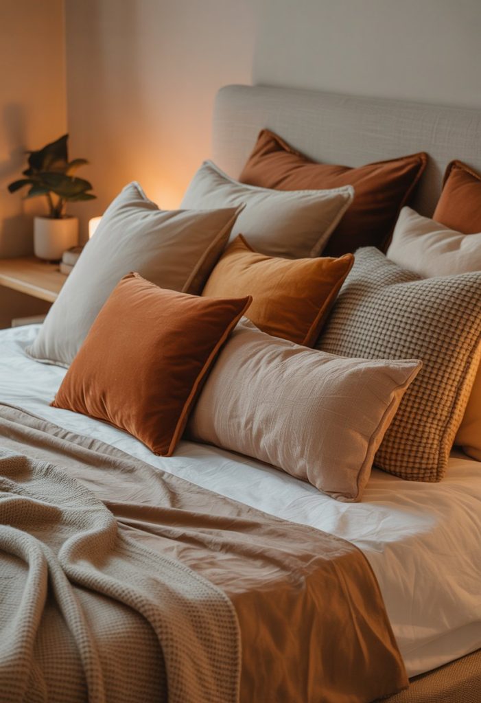 Layer pillows in earthy colors like terracotta, olive, and warm browns. The combination looks inviting and lived-in.