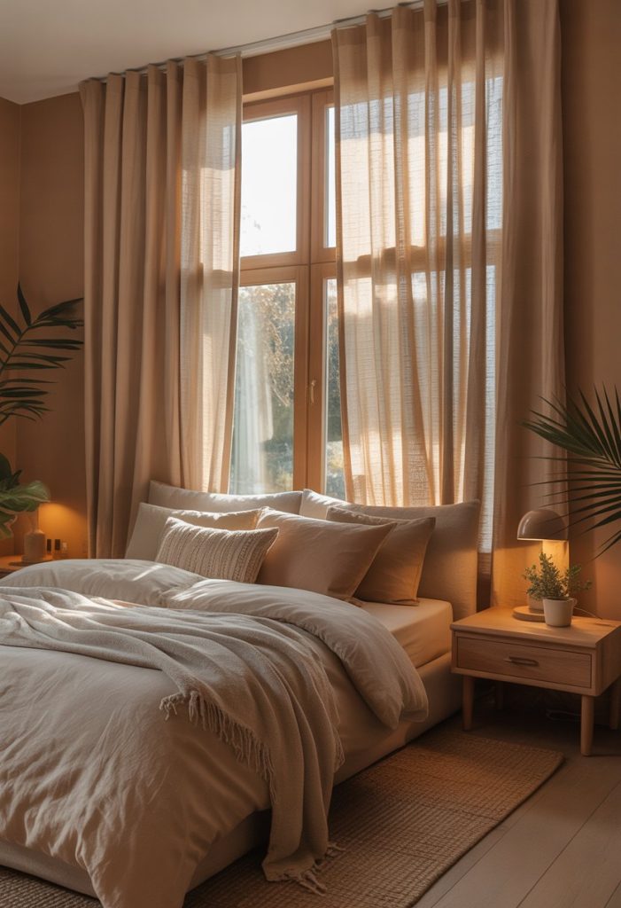 Sand-colored linen curtains add warmth and softness to any bedroom. The natural beige and cream shades feel inviting.