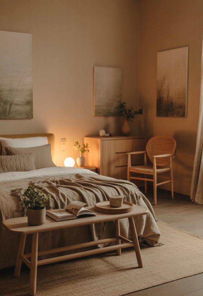 Linen bedding, a wool throw, or a single wooden bowl can make the space feel grounded. Sometimes less really is more.