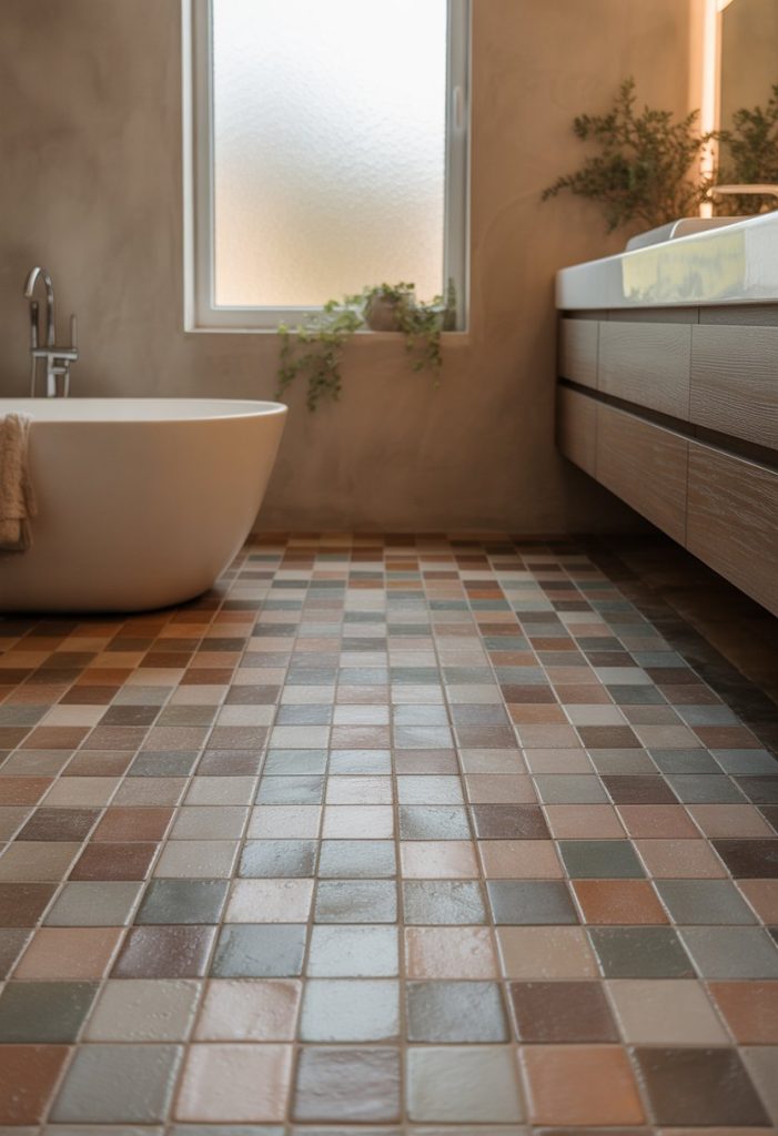 Mushroom-toned ceramic tiles bring warmth to your bathroom floor. These earthy colors stay neutral but add a cozy vibe.