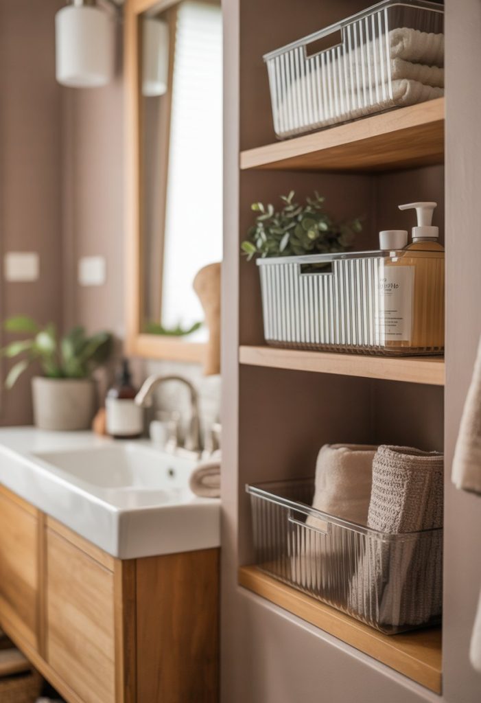 Warm gray acrylic baskets keep your bathroom organized and stylish. They blend right in with neutral colors.