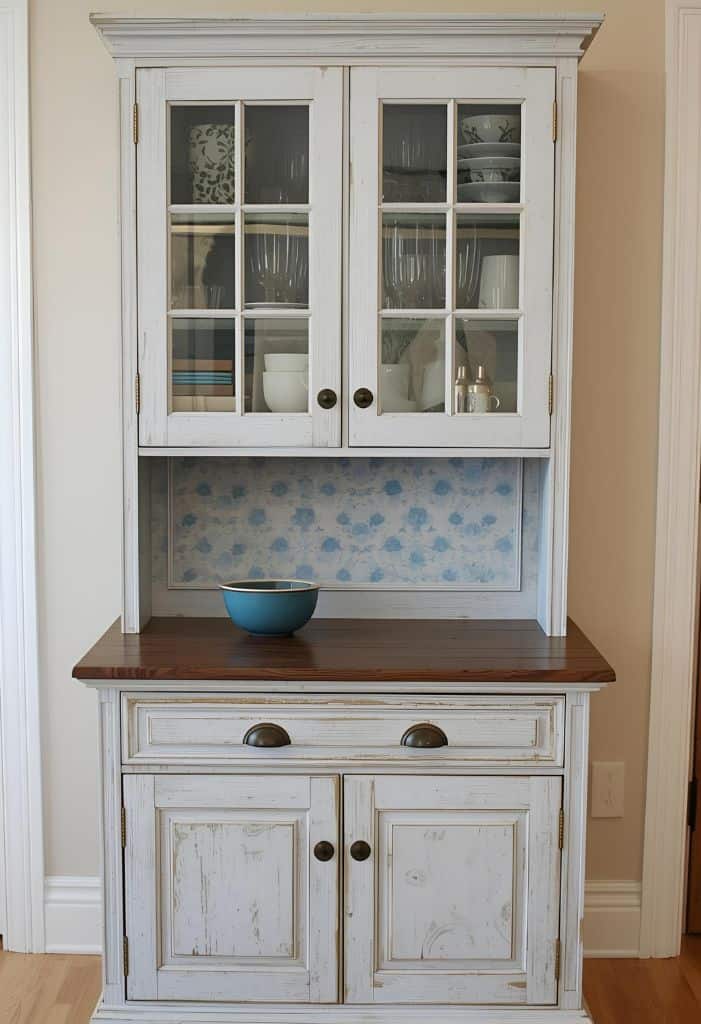 A painted whitewashed pine cabinet adds rustic charm. The soft white finish lets the wood grain peek through.