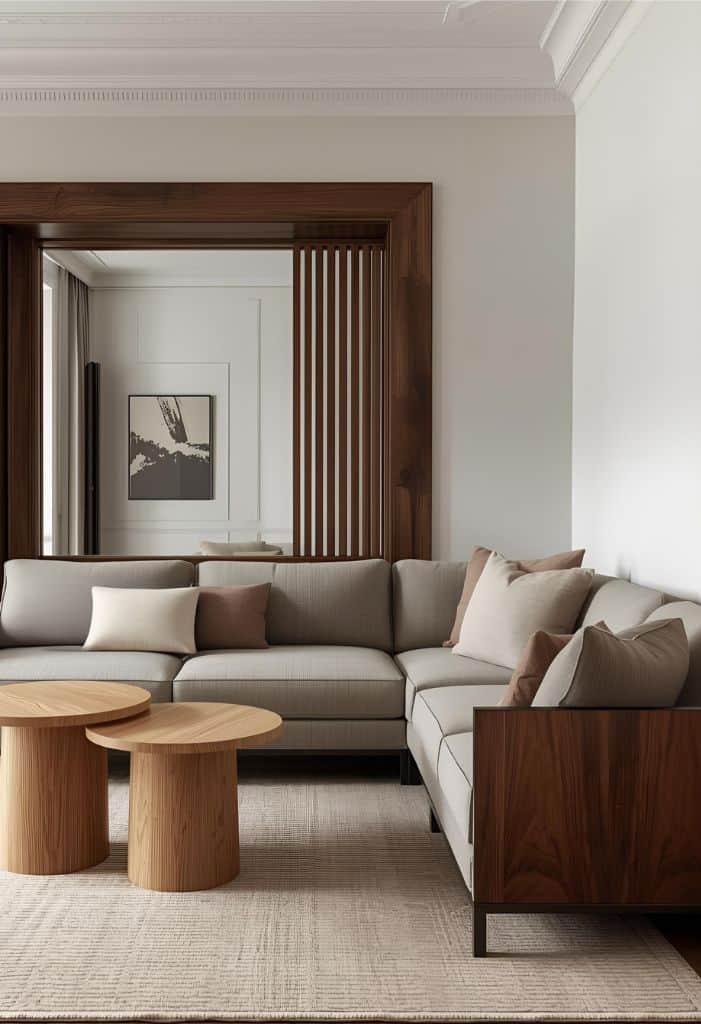 A walnut framed sectional sofa introduces deep, dark wood tones. That contrast against pale walls is just striking.