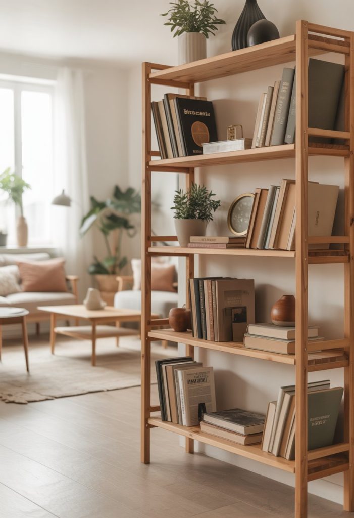 A pine bookshelf brings that clean Nordic vibe into your living room. The light wood finish keeps things open and bright.