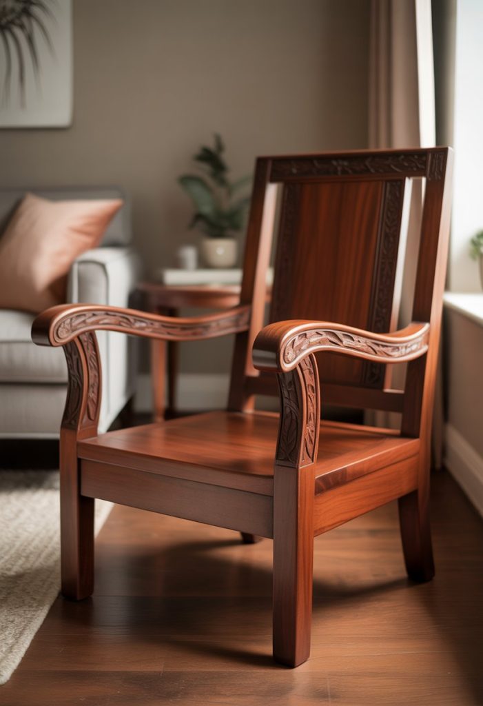 A hand-carved mahogany armchair brings elegance and a bit of drama to your living room. The reddish-brown wood just glows.